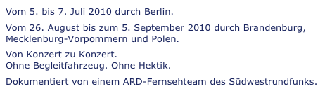 Der international renommierte Berliner Pianist Markus Groh begab sich zum Gedenkjahr Chopins und Schumanns auf eine außergewöhnliche Konzerttournee. In einem Selbstversuch beschwor er die Zeiten Chopins und Schumanns herauf und reiste, wie damals üblich, mit einer Kutsche und eigenem Instrument durch die Lande, von Auftritt zu Auftritt. Dabei ging es nicht um ein kostümiertes Re-enactment, sondern um das Erlebnis einer Konzertreise unter möglichst historischen Bedingungen. Fuhrwerk und Reise-Logistik machten das Tempo und die Umstände der damaligen Zeit erfahrbar. Das Instrument, das Markus Groh auf der Kutsche mitnahm, ist eine Replik des ersten Konzertflügels des deutschen Klavierbauers Heinrich Steinweg (später: Steinway) von 1836.